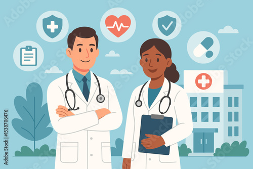 Medical team concept with diverse doctors. Man and woman healthcare professionals in front of hospital building. Vector illustration with icons for health, care, and insurance.