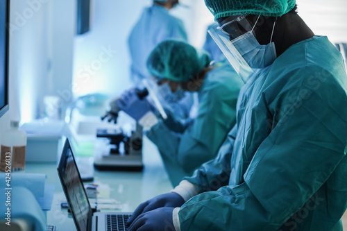 Medical workers working with computer and micoroscope inside hospital laboratory during coronavirus outbreak - Focus on african man face