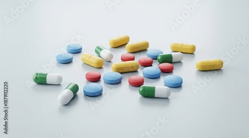 Medicine and healthcare concept. Pile of various colorful pills, capsules and tablets on a neutral background.