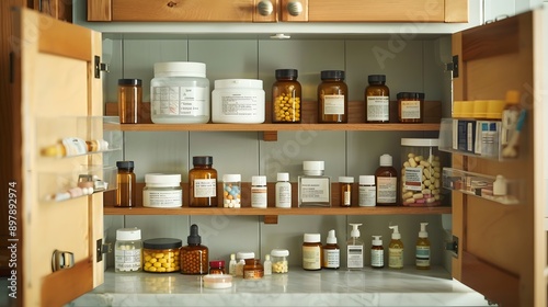 medicine cabinet, organisation, storage, bottle, jar, pill, tablet, vitamin, supplement, health, wellness, health care, home, bathroom, cabinet, shelf, white, wood, interior, design, tidy, clean, organised, neat, minimalist, modern, lifestyle
