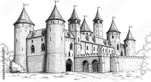 castle, vignetting, tower, wall, mediaeval, fortress, draw, ink, hand-drawn, line, art, architecture, detail, stone, gate, arched, battlement, illustration, clear, sharp, shading, background, white, historical, vintage, design, gothic, palace, fantasy, structure, ancient, perspective, realistic, old, graphic, monochrome, outline, pen, sketching, heritage, stronghold, defense, historic, iconic, landmark, building, europa, history