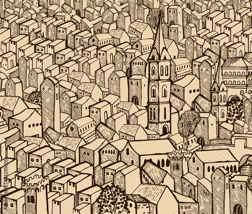 vintage, town, city, building, tree, vegetation, architecture, mediaeval, urban, map, brown, grid, paper, church, construction, historical, house, tower, drawing, vector, district, agglomeration