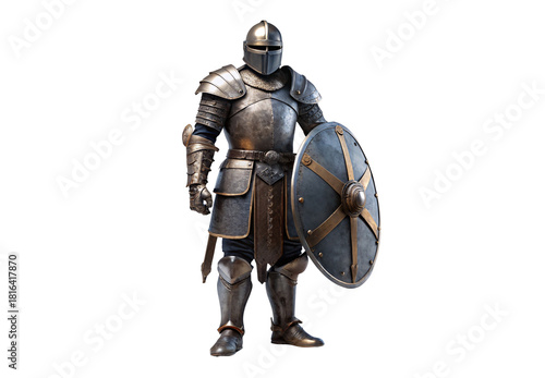 Medieval knight in full plate armor holding sword and shield, isolated on a transparent background