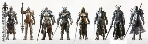 knight, mediaeval, armoring, sword, warrior, weapon, history, battle, metal, steel, helmet, shield, fighting, soldier, costume, fantasy, character, strong, power, protection, chivalry, honour, courage, war, combat, ancient, historical, europa, design, illustration, art, digital artwork, full-length, standing, group, white background, cut-out, variation, different, holding, posing