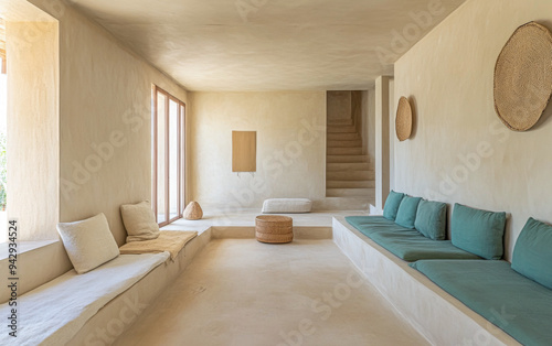 Mediterranean luxury villa in modern style with earthy tones and minimalist geometrical spaces. Premium Real Estate image.