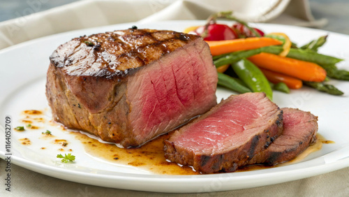 Medium rare filet mignon with a pat of butter on top. The meat looks delicious, with a juicy texture and rich colors.