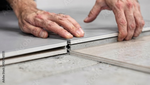 Medium shot of hands fitting modular panels over an existing surface with sharp focus on the edges to highlight precise alignment and blurred background.