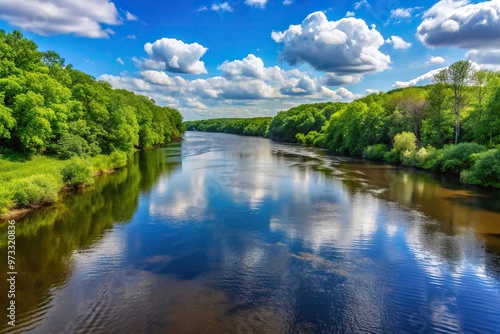 Medium shot of the Connecticut River flowing north of Hartford in June, north, scenic, summer, serenity, countryside, river, Hartford, water, beauty, nature, outdoor, June, tranquil