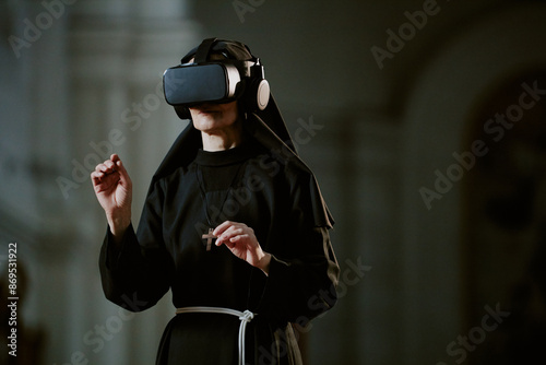 church, nun, ar, headset, monastic, sister, catholic, faith, technology, reality, virtual, education, religion, pray, pious, workday, device, contraption, modern, futuristic, work, online, cross, abbey, monastery, cathedral, christianity, gospel, holy, devotion, theology, believe, spiritual, worship, lifestyle, indoor, woman, mature, caucasian