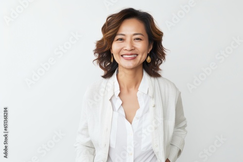 Medium shot portrait photography of a cheerful Vietnamese woman in her 40s against a white background
