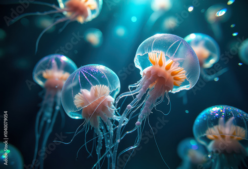 Medusas translúcidas con tentáculos finos y colores naranjas flotan en aguas profundas, iluminadas suavemente.