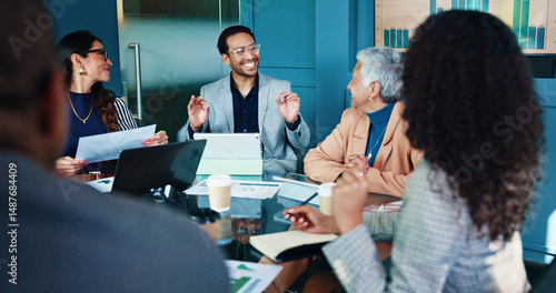 Meeting, laptop and business people in discussion for financial consulting, budget review and investment. Professional, corporate team and men with women for finance report, strategy and planning