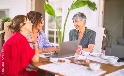 Meeting of middle age women having lunch and drinking coffee. Mature friends smiling happy using laptop at home on a sunny day