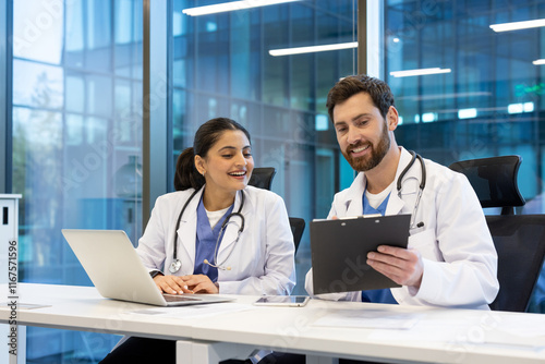 Meeting of two doctors, male and female doctors in white medical coats sitting at a table with a laptop discussing a patient's diagnosis, diverse team of doctors .
