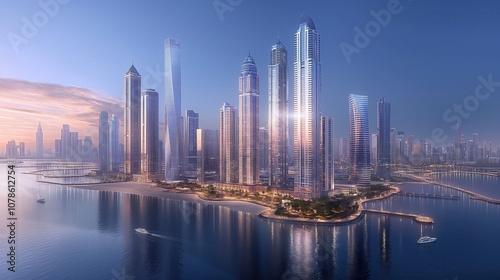 Mega tall skyscrapers. Modern glass skyscrapers against the sky. Tall modern skyscrapers with glass facades reflecting the surroundings. Night architecture.