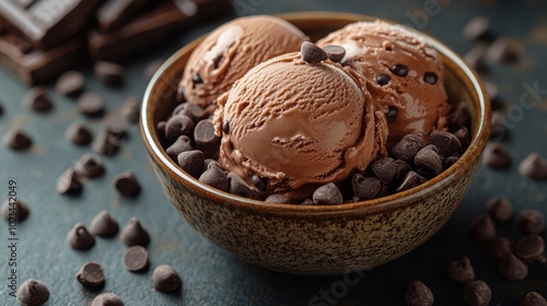 Melting chocolate ice cream in a bowl, surrounded by chocolate chips, rustic table