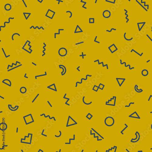 Memphis seamless pattern on gold background. Hipster memphis style. Trendy memphis style. Geometric seamless pattern different shapes black color. Vector Illustration