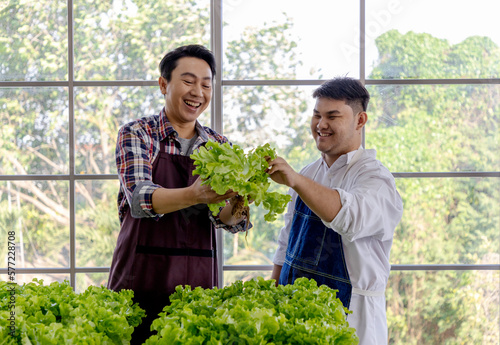 Men farmers inspect lettuce in greenhouse farms.
