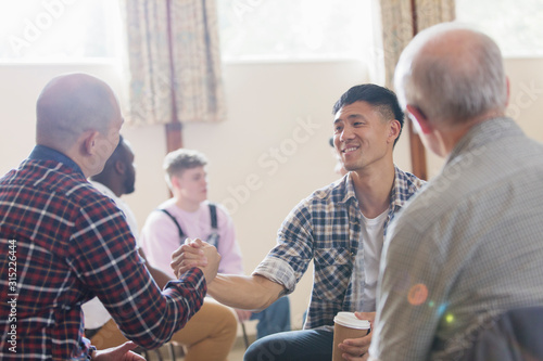 Men shaking hands in group therapy in community center
