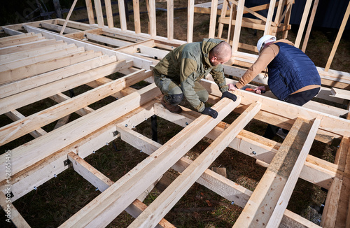 Men workers building wooden frame house on pile foundation. Carpenter hammering nail into wooden board, using hammer. Carpentry concept.