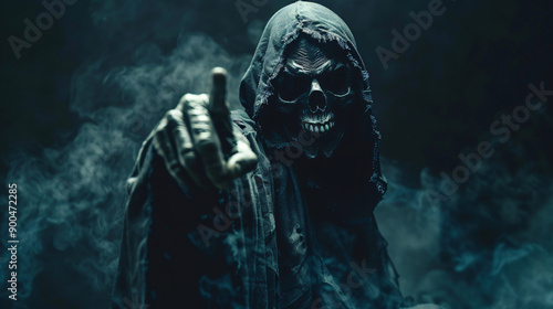 grim, reaper, death, halloween, scarey, horror, dark, skittish, evil, costume, monster, night, fear, mystery, fantasy, danger, apocalypse, smoke, pointing, finger, robe, skull, mask, creepy, background, gothic, nightmare, supernatural, occult, undead, daemon
