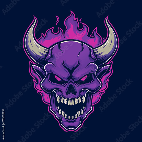 Menacing purple demon skull with fiery horns illustration. Dark fantasy monster character vector graphic art.
