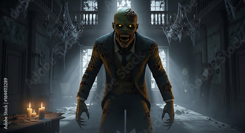 zombie, halloween, monster, undead, scarey, creepy, horror, decaying, room, candle, spider's web, skittish, supernatural, nightmare, ghoul, creature, dark, eerie, haunted, terrifying, stand, dilapidated, illuminated, candlelight, hang, from, adding, atmosphere, glowing, eye, sharp, claw, create, sense, doom, menacing, with