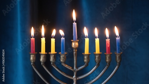 menorah, candle, jewish, holiday, celebration, tradition, religion, faith, light, festival, 8, 7, blue, yellow, red, gold, silver, flames, burning, festive, spiritual, symbol, culture, heritage, december, winter, israel