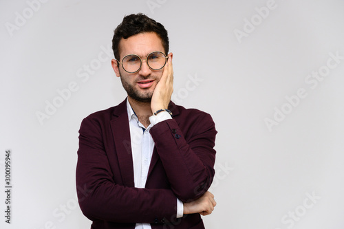 Men's fashion concept. Portrait of a handsome male model in glasses shows hands wearing a dark jacket, posing on a gray background. Black hair. Close Studio Shot