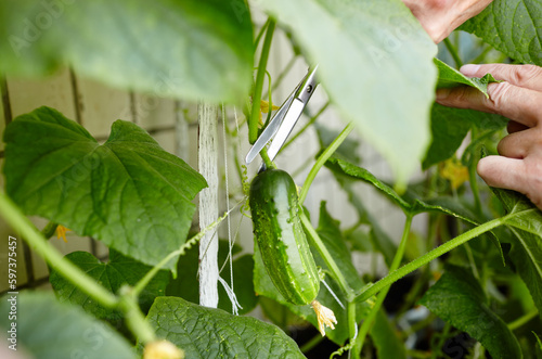 Men's hands harvests cuts the cucumber with scissors. Farmer man gardening in home greenhouse