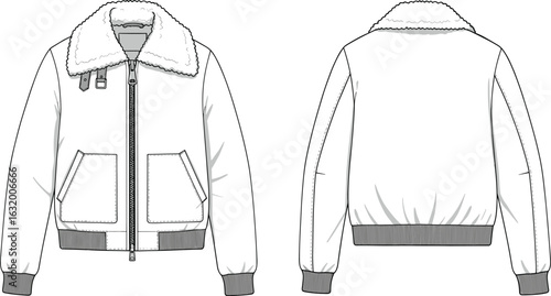 Men’s sherpa-collar bomber jacket, zip front, flap pockets, ribbed cuffs and hem, casual winter outerwear, digital fashion flat illustration