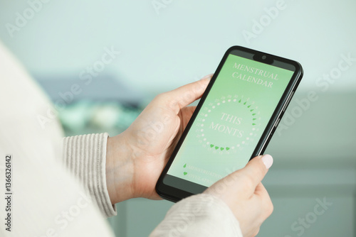 Menstruation. Woman using period calendar application on smartphone indoors, closeup