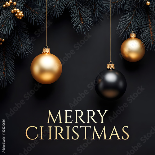 christmas, merry, greeting, text, typography, card, holiday, new, year, black, background, gold, gold, bauble, ball, ornament, tree branch, fir, pine, needle, decoration, elegant, modern, minimalist, luxury, stylish, chic, celebration, festive, winter, december, night, contrast, frame, border, design, banner, poster, template, copy space