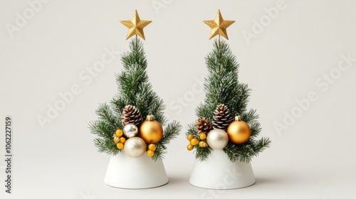 Merry Christmas and Happy New Year! Festive composition of a white Christmas tree with a star and green pine branches around it on a light background in a minimalist style.