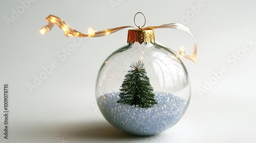 Merry Christmas and Happy New Year. Glass Christmas ornament ball with miniature snow and trees inside, Xmas lights background
