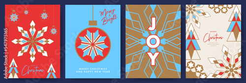Merry Christmas and Happy New Year greeting card Set. Modern Xmas design with typography and beautiful geometric snowflakes, Christmas tree and balls. Minimal banner, poster, cover, layout template.