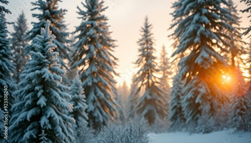merry christmas background with a serene winter forest, tall pine trees covered in snow, and a soft golden glow from the setting sun, copy space in the foreground, high detail, ai