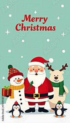 Merry christmas greeting with santa claus, snowman, reindeer, and penguins on a festive with falling snow