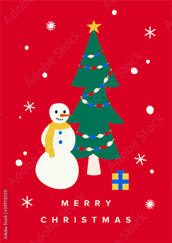 Merry Christmas greetings postcard with snowman and Christmas tree on the red background.