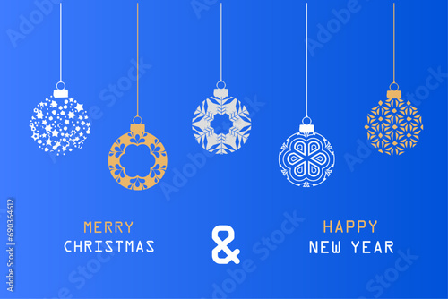 Merry Christmas modern card banner with hanging ball decorations. Merry Christmas and happy new year. Greeting text vector illustration