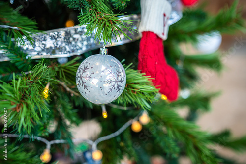 Merry x-mas,Close up of Colorful balls ,gifts box and Christmas greeting picture parcel,bell decoration on Green Christmas tree background Decoration During Christmas and New Year.