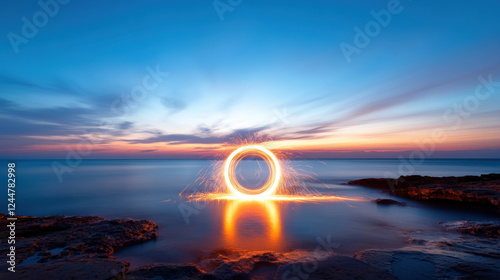 light, trail, steel, wool, spinning, rocky, shore, sunset, ocean, water, long, exposure, fire, circle, glow, spark, evening, landscape, nature, motion, horizon, sky, blue, orange, calm, tranquil, scenic, beautiful, artistic, creative, adventure, illumination, bright, dynamic, serene, no people