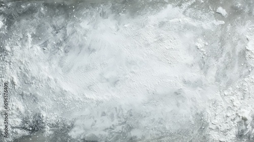 Messy flour spread on gray backdrop creating abstract textured background for bakery, cooking, pastry and food preparation themes, symbolizing rustic kitchen, baking ingredients culinary art concept
