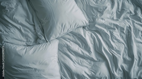 Messy white sheets, pillows, bedroom, top view, sleep