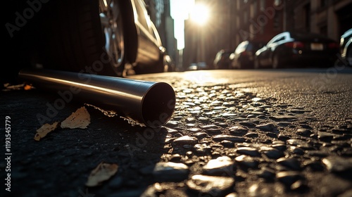 city, street, sunset, metal, cylinder, pipe, tube, urban, asphalt, road, sun, light, shadow, car, vehicle, automobile, transportation, background, texture, ground, dark, evening, day, autumn, leaf, fall, grunge, detail, close, up, object, discarded, forgotten, lost, perspective, blurry, bokeh, sharpened, depth, low, angle, view