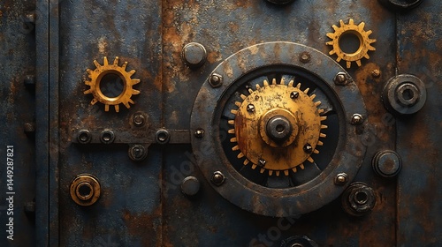 Metal door with ornate gears and bolt details; steampunk-inspired texture. Dark blues and golden hues