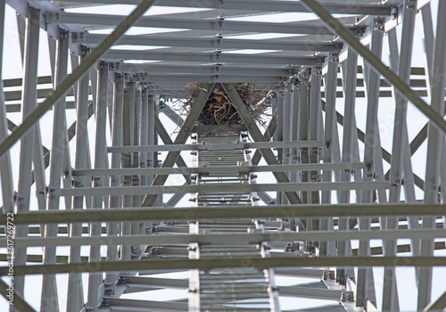 background, bird, blue, blue skies, cloud, electrical, electricity, energy, engineering, environment, industrial, industry, metal, nest, plant, pole, pollution, power, sky, technology, white, white cloud
