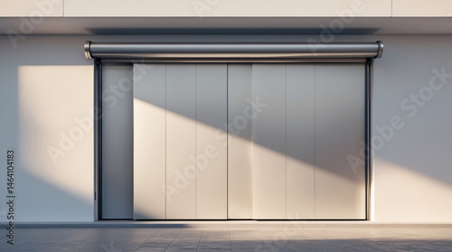 Metal rolling shutter door closed on contemporary retail facade providing secure access and minimalist commercial architecture visual appeal Wallpaper Background Exterior Design
