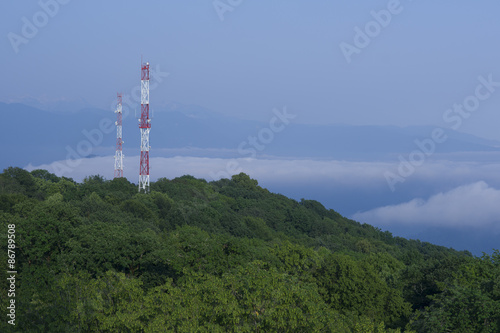 Metal structures on the top of high mountain in fog