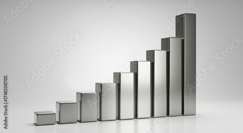 bar chart, graph, growth, increase, progress, upward, trend, business, finance, datum, statistic, analysis, success, achievement, performance, economy, investment, profit, revenue, sale, marketing, strategy, development, planning, future, concept, abstract, three-dimensional, metallic, silver, chrome, shiny, clean, modern, minimalist, studio shot, white background, isolated, digital, illustration, visualisation, chart, report, up